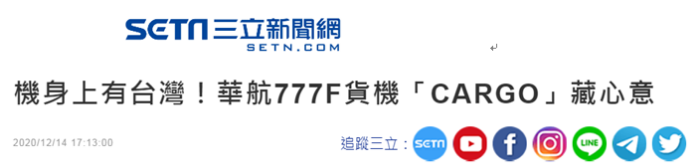 據“ETtoday新聞雲”報道,華航全新機身塗裝亮相,從公開的首架777F貨機照片中可看出原本的的英文名字“CHINA AIRLINES”字體縮小,位置也被移到機身尾段,貨運標誌“CARGO”中則藏有台灣地圖形狀,不過未見“TAIWAN”字樣。一直以來,島內綠營打着提高所謂“台灣辨識度”的名義小動作不斷,對於華航機身塗裝出現台灣地圖,島內綠媒“三立新聞網”昨天(14日)在報道時掩飾不住興奮,標題上出現“機身上有台灣”字樣。