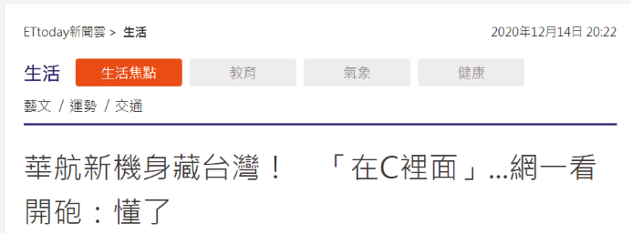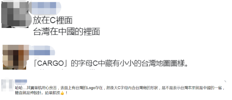 然而,“ETtoday新聞雲”稱,華航新塗裝照片曝光後引起島內許多網友討論。有網友稱:“台灣藏在C( 注:China)裏面,懂了”。“台灣被包在C裏面,代表台灣屬於中國,邏輯正確。”“這個台灣藏太好了。”“C中藏有小小的台灣地圖圖樣”。