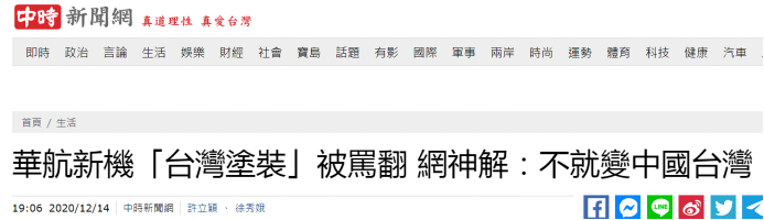 台灣中華航空(華航)貨機新塗裝昨天(14日)曝光,機身英文“CARGO(貨機)”裏藏台灣地圖形狀。然而,就在島內綠媒歡呼“機身上有台灣”沒多久,台媒12月15日消息稱,華航貨機新塗裝被罵翻。有島內網友稱:“台灣藏在C( 注:China)裏面,懂了”。 還有島內網友問:這個設計是不是説台灣是中國的一部分?對此,大陸網友則稱,台灣本來就屬於中國,沒毛病。
