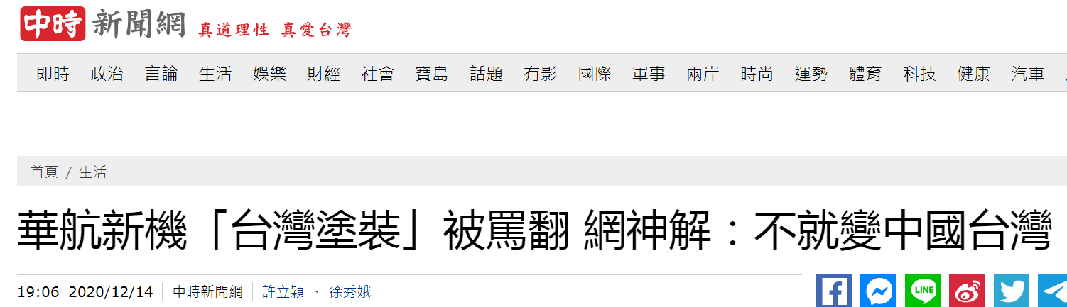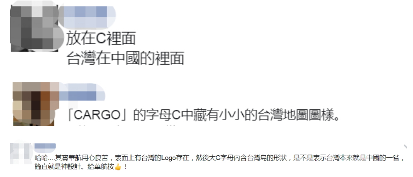 然而,“ETtoday新聞雲”稱,華航新塗裝照片曝光後引起島內許多網友討論。有網友稱:“台灣藏在C( 注:China)裏面,懂了”。“台灣被包在C裏面,代表台灣屬於中國,邏輯正確。”“這個台灣藏太好了。”“C中藏有小小的台灣地圖圖樣”。