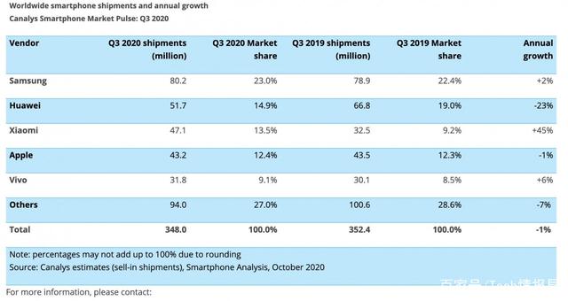 日前,多家市場調研機構相繼發佈第三季度全球智能手機市場排名情況。數據顯示,三星以8080萬台出貨量的成績重回世界第一,華為排名第二,而小米則打敗蘋果佔據全球市場份額第三的位置,蘋果排在了第四位,緊隨其後的是vivo。