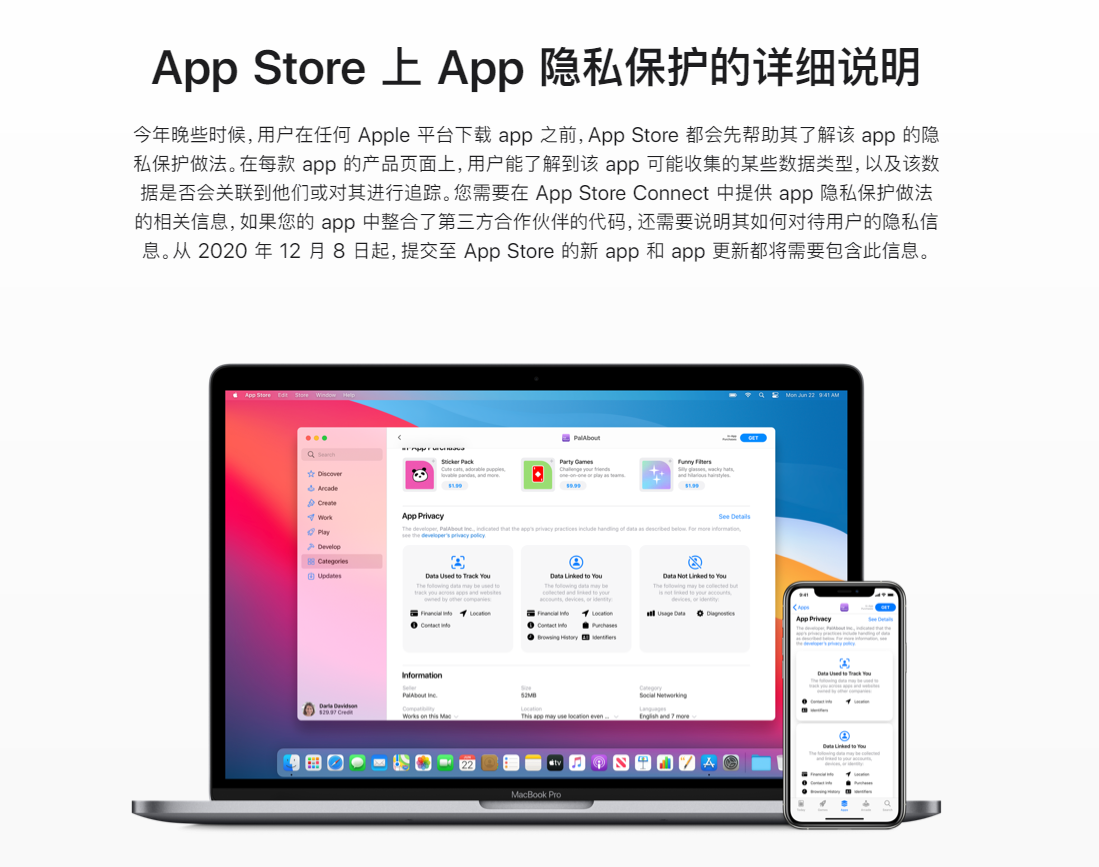 12月15日凌晨,蘋果公司對開發者頁面中關於App 隱私保護的詳細説明進行了更新,正式要求開發者提交更新或有新版本時,每個 AppStore 裏所有的 app 都要求提交新的隱私慣例信息,包括蘋果自己開發的APP,該要求覆蓋iOS、iPadOS、macOS、watchOS 和 tvOS。