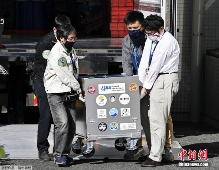 當地時間12月14日,日本神奈川相模原市,日本航空航天局(JAXA)公佈由“隼鳥2號”收集並帶回的小行星表面稀有樣本。圖為工作人員運送裝有樣本的箱子。