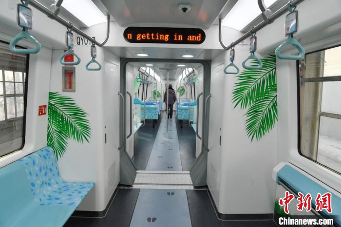 記者在現場看到,該列車流線型的車頭酷似一個微笑的海豚,外觀彩繪中融入了丹頂鶴等多種可愛的動物造型,在內飾設計上加入了清涼的森林主題等元素。