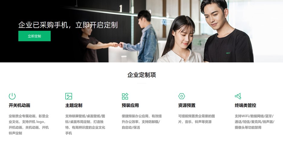 隨着企業業務商城上線,OPPO還同步更新了企業業務官網,展現了企業專屬定製能力、接口研發能力、解決方案能力、生態合作能力等多項領先能力,讓企業客户快速瞭解定製業務,提高採購和定製效率,並以最優惠的價格享受到智能終端定製服務。