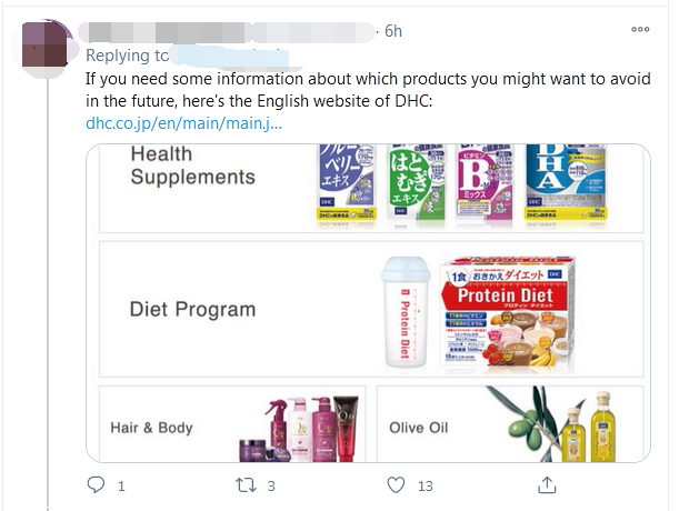 一位座標東京的網友乾脆在推特上將DHC的英文官網附圖貼了出來,稱“如果未來你想避免購買DHC的產品而需要一些信息的話,這裏是它們的英文官網。”↓