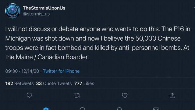 近日,一名擁有近5萬名粉絲的推特賬號發佈一則陰謀論,聲稱美國緬因州與加拿大邊境集結了數以萬計的中國軍隊,上週在密歇根州墜毀的一架F-16戰鬥機,大概是被中國人擊落的。
