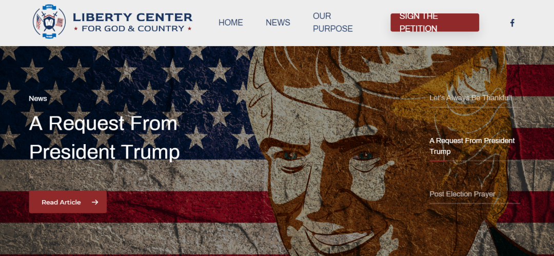 從官網看,這個名叫“上帝與家園自由中心”的組織宣稱要“維護美國憲法權威、保護美國民主”,網站主頁曾以“特朗普總統的號召”為名發佈了一個公開信,呼籲其支持者抵制今年美國大選中所謂的“選舉欺詐”現象。此外,該組織的Facebook等社交媒體平台也會日常更新,但不少內容都是被闢謠的“陰謀論”。