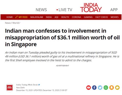 【環球網報道 記者 張曉雅】綜合《今日印度》及印度報業托拉斯(PTI)報道,一名印度男子當地時間15日承認自己曾參與從新加坡一家跨國煉油廠盜走價值4900萬新加坡元(約3610萬美元)的油品。