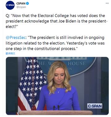 據美國有線衞星公共事務電視網(CSPAN)報道,在當地時間15日舉行的記者會上,有記者提問道:現在選舉人團投票了,總統(特朗普)承認喬•拜登是當選總統嗎?