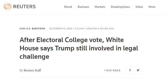 路透社:在選舉人團投票後,白宮表示特朗普仍在參與法律挑戰