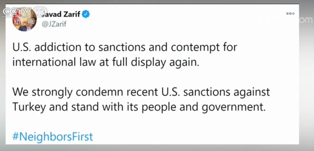伊朗外長扎裏夫15日也在社交媒體上譴責美國的制裁行為再一次違反了國際法,並表達對土耳其人民和政府的支持。