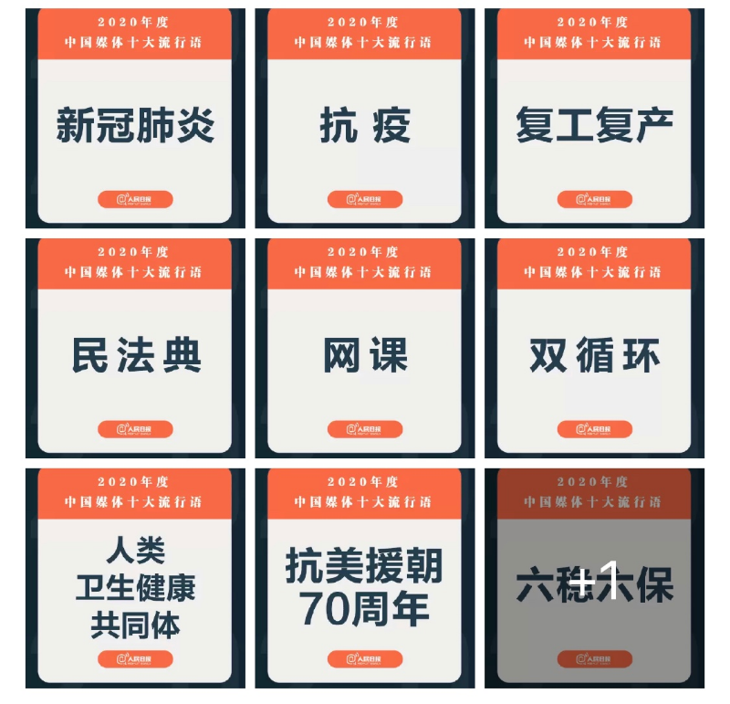 近日,“2020年度中國媒體十大流行語”如期出爐,依次為:新冠肺炎、抗疫、復工復產、民法典、網課、雙循環、人類衞生健康共同體、抗美援朝70週年、六穩六保、嫦娥五號。令人矚目的是,十大流行語裏,與新冠肺炎疫情相關的詞彙多達7個。這既是對全年重點事件的忠實盤點,也從一個側面記錄了中國上下抗擊疫情的非凡歷程。