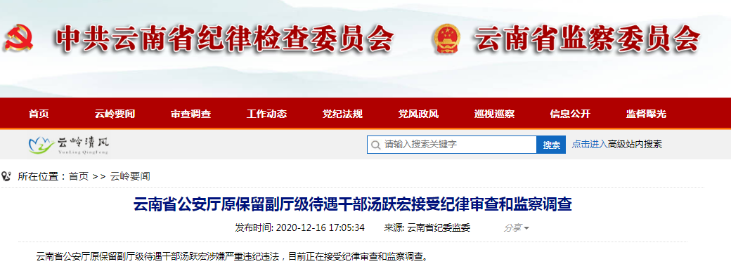 雲南省公安廳原保留副廳級待遇幹部湯躍宏涉嫌嚴重違紀違法,目前正在接受紀律審查和監察調查。
