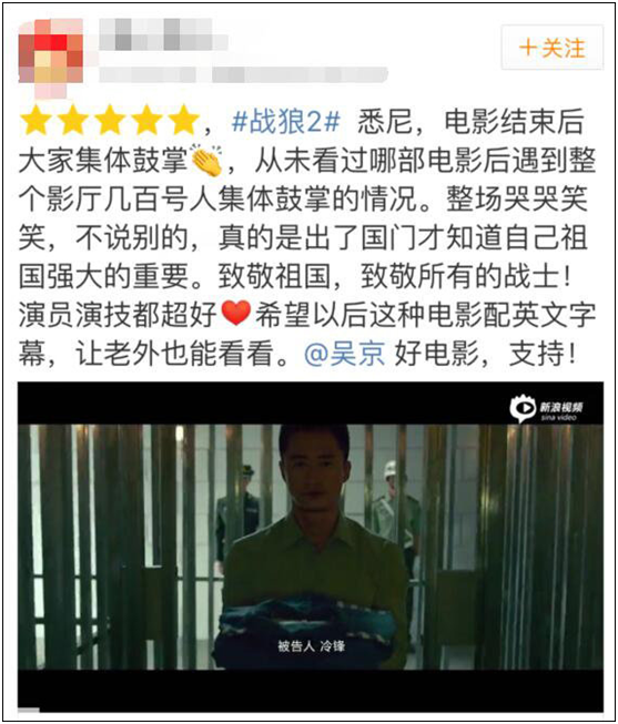 影片上映後,我幾乎隔三五分鐘就在微博、貼吧上搜評價,發現觀眾的反饋中99%都很正面,我就覺得我們做對了,觀眾能接受這樣一種表現形式。我印象很深的是,《戰狼2》上映時,第二天就有澳大利亞的朋友給我發來當地媒體的報道,説電影上映第二天,當地華僑自發組織去電影院觀影,這些觀眾都是揮舞着五星紅旗去影院,看完電影出來還高唱國歌。這些情況我們沒想到,所以我覺得我們做的一切都很值得,無愧於這個時代。