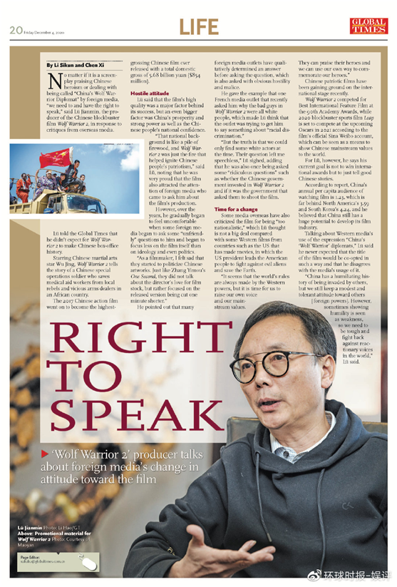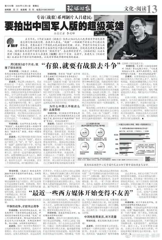直至今天,3年前上映的《戰狼2》依然以56.8億元人民幣穩坐中國電影票房總排行榜頭把交椅。在很多人看來,“戰狼”一詞被賦予的含義早已超出電影本身,更象徵着當下中國民眾民族情緒的覺醒。近日,中國外交部發言人趙立堅在推特上轉發澳軍士兵在阿富汗暴行的諷刺插畫,引起澳總理莫里森強烈不滿,國外媒體再次將中國外交稱為“戰狼外交”。在這樣的背景下,《環球時報》記者本週對《戰狼》系列影片製片人呂建民(如圖)進行了專訪。採訪中,呂建民與《環球時報》記者分享了影片創作的初衷,以及對軍事戰爭題材電影的看法。
