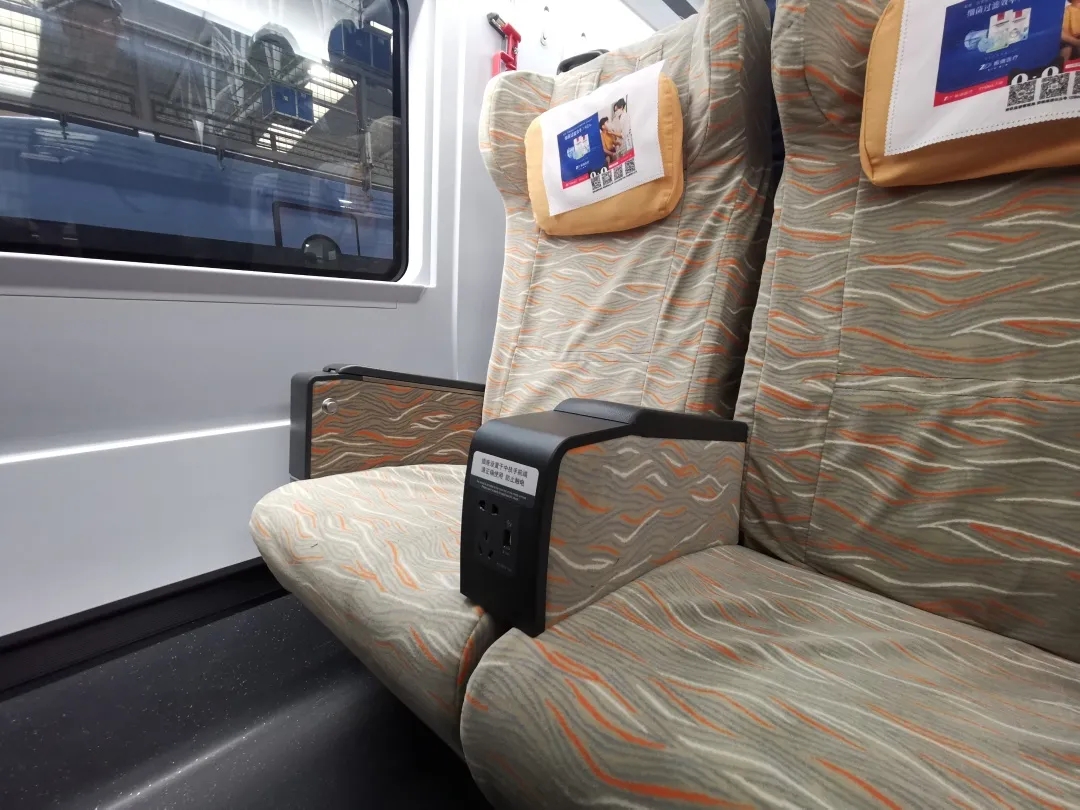 二等3人座椅的兩坐墊之間設置2個插座,每個插座面板集成1個三孔、1個兩孔、1個USB口電源,旅客使用電子設備更加方便。垃圾箱分為可回收垃圾和不可回收垃圾,更加註重車內環保。