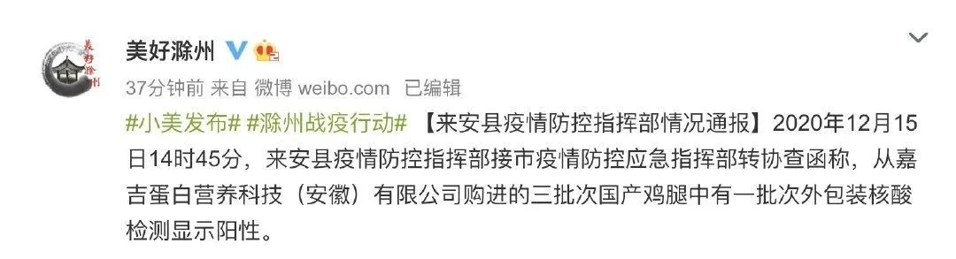 安徽滁州來安縣疫情防控指揮部消息,昨天,來安縣疫情防控指揮部接市疫情防控應急指揮部轉協查函稱,從嘉吉蛋白營養科技(安徽)有限公司購進的三批次國產雞腿中有一批次外包裝核酸檢測顯示陽性。