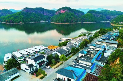 福建省三明市泰寧縣大金湖畔的梅口鄉水際村及遊客碼頭。新華社記者 姜克紅攝