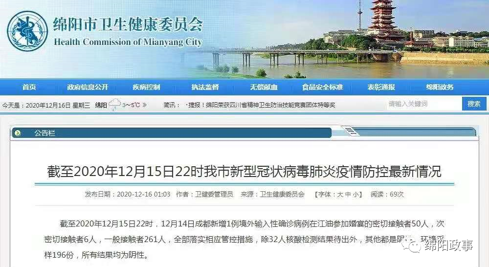 截至2020年12月15日22時,12月14日成都新增1例境外輸入性確診病例在江油參加婚宴的密切接觸者50人,次密切接觸者6人,一般接觸者261人,全部落實相應管控措施,除32人核酸檢測結果待出外,其他都是陰性。環境採樣196份,所有結果均為陰性。