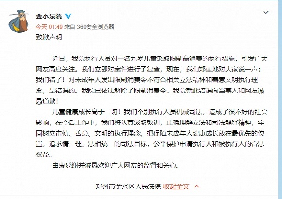 對9歲兒童採取限制高消費,鄭州金水法院致歉