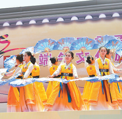 在明東村端午文化旅遊節上,孩子們在表演傳統扇子舞。