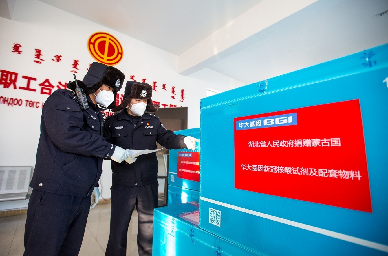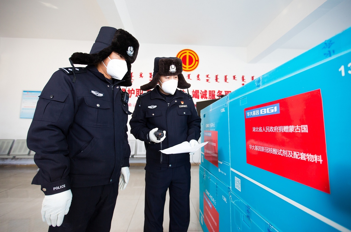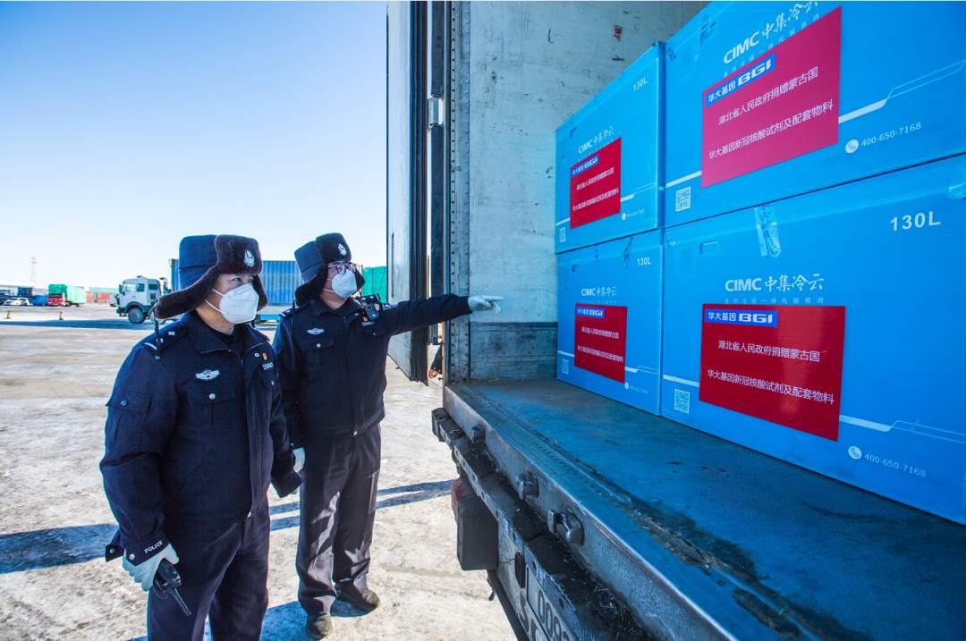 12月15日,湖北省捐贈蒙古國的防疫物資從內蒙古二連浩特公路口岸出境,內蒙古出入境邊防檢查總站二連出入境邊防檢查站開通防疫物資專用通道,採取專人專崗,優先查驗的方式,第一時間為載運防疫物資車輛辦理了邊防檢查手續,確保捐贈防疫物資以最快的速度送往蒙古國疫情防控一線。