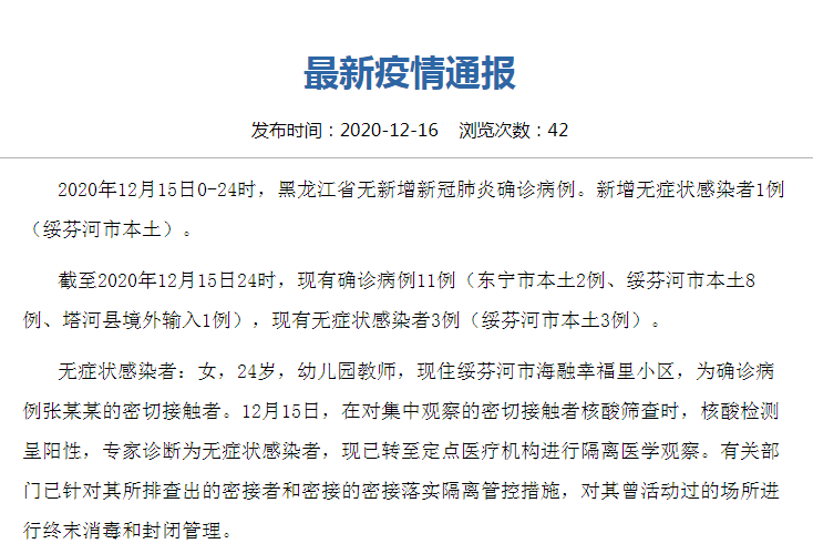 截至2020年12月15日24時,現有確診病例11例(東寧市本土2例、綏芬河市本土8例、塔河縣境外輸入1例),現有無症狀感染者3例(綏芬河市本土3例)。