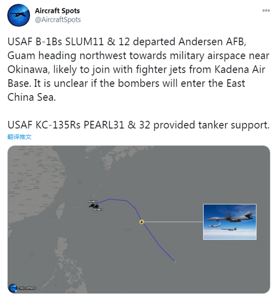 專門記錄軍事飛行器動態的推特賬號“飛機守望”12月16日發佈消息稱,當天兩架美國空軍的B-1B轟炸機從關島安德森空軍基地起飛,朝着西北方向飛往沖繩附近的空域。“飛機守望”推測,這兩架B-1B轟炸機可能會與從嘉手納空軍基地起飛的戰鬥機匯合,目前還不清楚這些轟炸機是否會進入東海。