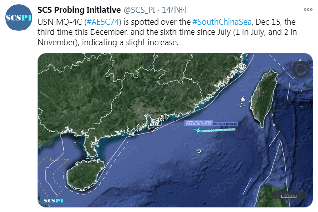 “南海戰略態勢感知”計劃平台12月15日發佈消息稱,當天一架美國海軍的MQ-4C無人偵察機出現在南海上空,該機於當天中午在台灣海峽南端朝着廣東省海岸飛行。這是本月第三次在南海上空發現該型無人機,該機還曾於7月1(1次)、11月(2次)進入過南海海域上空。