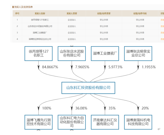科匯股份的第一大股東是“山東科匯投資股份有限公司”,根據公開信息顯示,該公司的主要股東中除了科匯股份實控人徐丙垠及127名職工之外,還包括“山東張店水泥股份有限公司”、“淄博工業搪瓷廠”和“淄博張店柳泉實業總公司”等。另據《全國企業信用信息公示系統》顯示,“山東張店水泥股份有限公司”早已於2009年11月25日被吊銷營業執照,也即這家公司在十餘年前就已經不存在了,但直到現在還仍然位列於“山東科匯投資股份有限公司”的股東名單中。