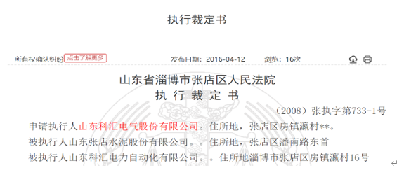 另據公開信息顯示,科匯股份早在2008年時曾被“山東科匯電氣股份有限公司”因財產權屬糾紛起訴,截止到2015年12月時,尚有15643058.65元未執行。經法院查明:“被執行人暫無財產可供執行,申請執行人也提供不出被執行人有可供執行的財產線索”;同時淄博市張店區人民法院也裁定:如發現被執行人有財產可供執行,申請執行人可以向本院申請執行剩餘債權。