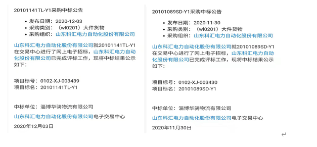 此外,根據公開信息顯示,科匯股份在今年多次就大件貨物運輸進行網上電子招標,最終的中標單位是“淄博華騁物流有限公司”。但據《全國企業信用信息公示系統》查詢,並不存在公司名稱為“淄博華騁物流有限公司”的企業註冊,僅有“淄博華騁運輸有限公司”。