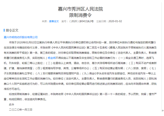 日發紡機招股書還披露,嘉興市明苑噴織有限公司是公司2019年主要客户,銷售3062萬元,但截至2020年6月30日,日發紡機對該公司的應收賬款仍高達1173萬元。工商資料顯示,嘉興市明苑噴織有限公司是一家老賴公司,公司法人已經被出具限制消費令。日發紡機是否存在應收賬款收不回來的風險,又是否足額計提了壞賬準備也值得關注。