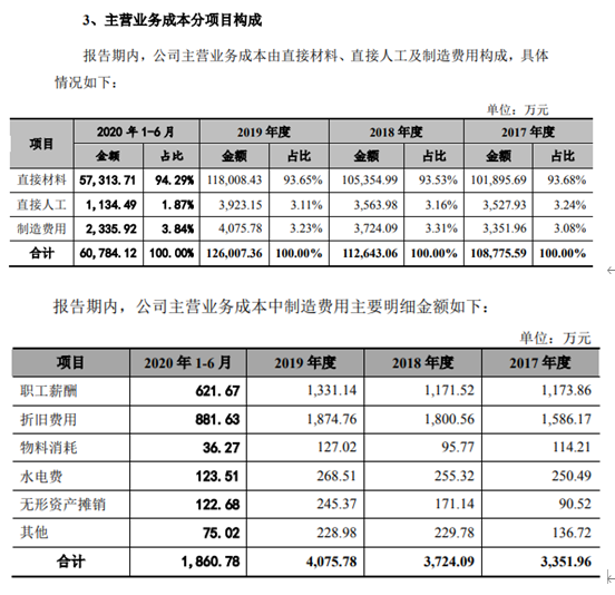 除了主要產品售價大跌外,公司財務數據也存在自相矛盾之處。招股書主營業務成本分項構成中表示,2020年1-6月,公司主營業務成本合計60784.12萬元,其中製造費用2335.92萬元,佔比3.84%,但在招股書372頁製造費用明細構成情況中又稱,2020年1-6月,公司主營業務成本中製造費用合計1860.78萬元。同一數據,同份招股書相差475.14萬元。