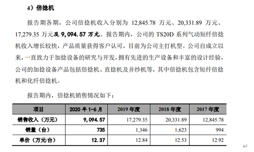 日發紡機從事成套紡織裝備的研發銷售,倍捻機是公司主要產品之一。招股書披露,報告期各期末,公司倍捻機收入分別為12845萬元、20331萬元、17279萬元和9094萬元。報告期內,倍捻機的銷售單價為12.37萬元/台至12.92萬元/台之間。