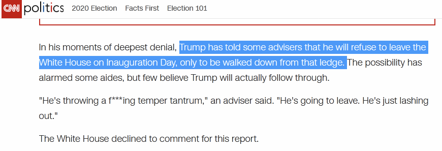 CNN報道截圖:特朗普曾告訴自己的幾名顧問,將拒絕在(拜登)就職典禮當天離開白宮,除非被人強行從窗沿上架出去