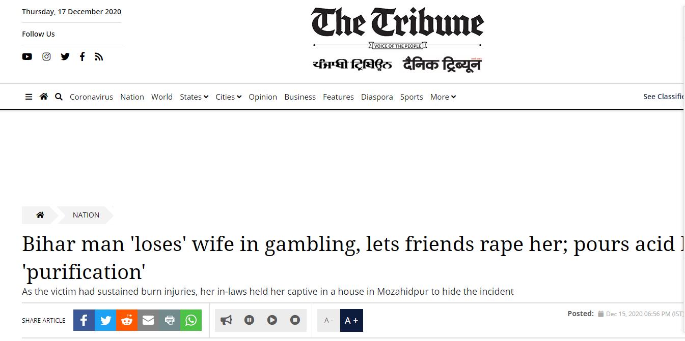 【環球網報道】據印度《論壇報》(The Tribune)12月15日報道,一位官員稱,印度比哈爾邦帕格爾布爾地區的一名男子在賭博中賭輸了自己的妻子。他隨後強迫妻子與他的賭徒朋友發生性關係,並在妻子拒絕繼續那樣做之後向她潑硫酸。