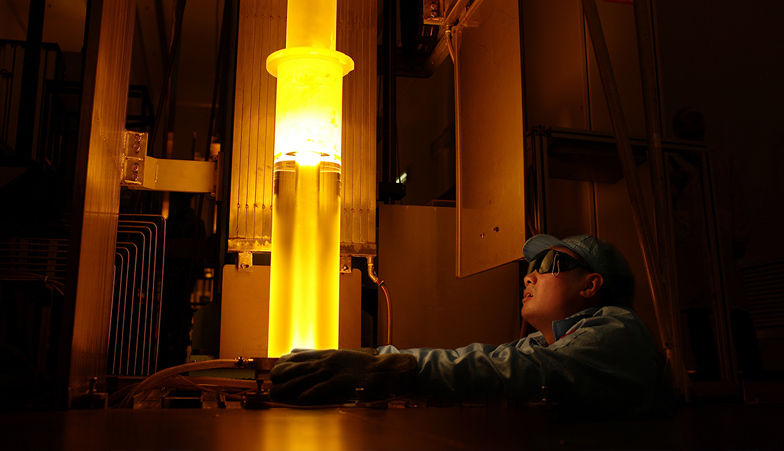 走進位於江蘇省蘇州市吳江區的亨通集團產品展示區,一根直徑200毫米、長度6米的光纖預製棒引人注目。工作人員告訴記者,這根自主研發的超大尺寸光纖預製棒可連續拉絲6天,拉絲長度達15000公里。