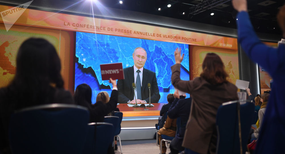 當地時間12月17日,俄羅斯總統普京舉行年度記者會。今年的記者會由於新冠疫情改在線上進行,普京在總統官邸新奧加廖沃與媒體代表視頻連線。