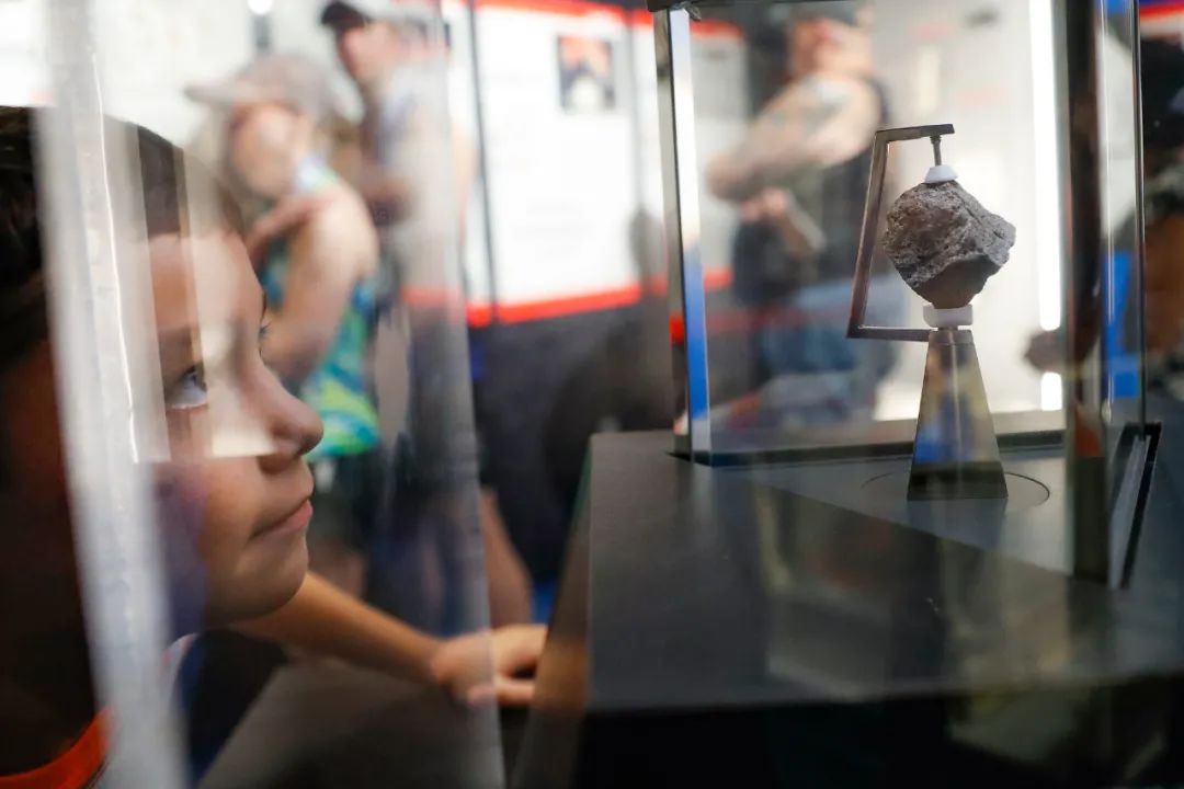 2019年7月20日,在美國俄亥俄州的沃帕科內塔,一名男孩在“尼爾·阿姆斯特朗航空航天博物館”內參觀一塊月球岩石樣本。新華社/美聯