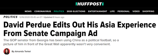 美國《赫芬郵報》昨晚就報道了這起頗為荒誕的事情。根據該報的介紹,正在代表共和黨角逐該州其中一個國會參議院席位的政客大衞·珀杜(David Perdue),近日發佈了一段他最新的競選廣告視頻,內容是關於他的個人經歷的介紹。