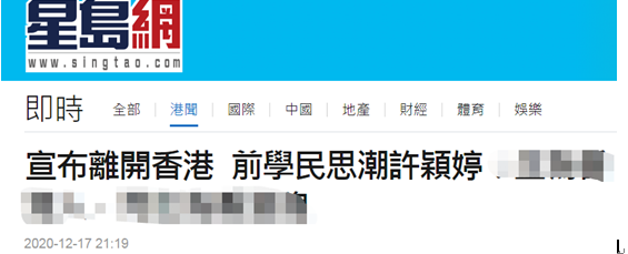 據香港“星島網”報道,許穎婷聲稱,自香港國安法生效後,她收到幾個不同來源的消息警示她離開,“經深思熟慮、一再拖延,最後無奈選擇離開香港”云云。