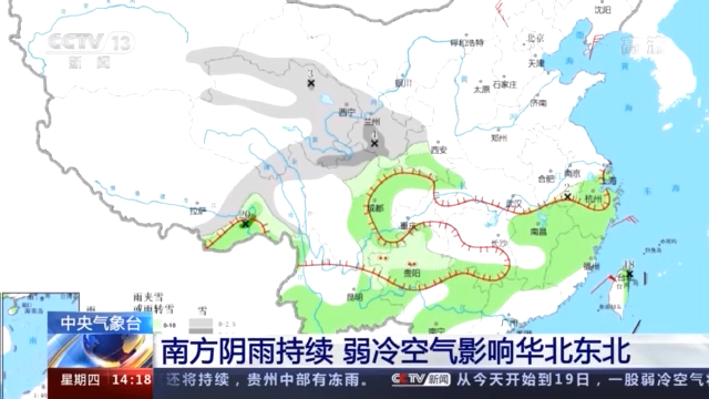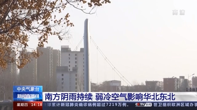 中央氣象台預報顯示,未來三天,我國南方大部仍被陰雨籠罩,回温乏力,貴州中北部的部分地區有凍雨,要注意防範。從今天(17日)開始,一股弱冷空氣將給東北、華北帶來小幅降温。