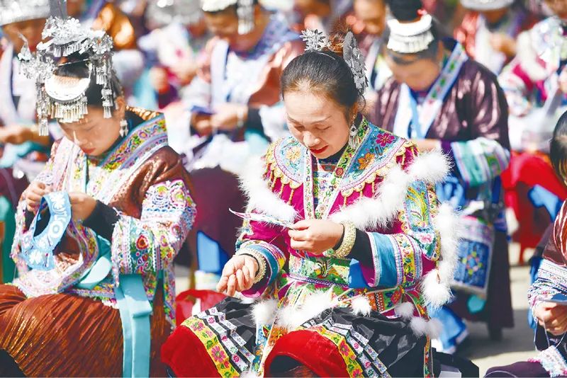 烏英苗寨位於廣西、貴州交界的大苗山深處,由於大部分青壯年外出務工,留守家園的婦女成為苗寨的重要勞動力。為了提高婦女脱貧致富的本領,當地婦聯、人社等部門採用“基地+繡娘+企業+市場”的模式,通過定期對繡娘進行培訓、收購繡品再加工並投入市場,幫助她們增加收入。圖為2019年10月18日,烏英苗寨婦女在培訓課上學習刺繡。新華社記者 黃孝邦/攝