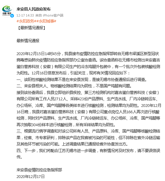 2020年12月15日14時45分,我縣接市疫情防控應急指揮部轉自無錫市梁溪區新型冠狀病毒感染肺炎疫情防控應急指揮部辦公室協查函。該協查函稱在無錫市檢測出來安嘉吉蛋白營養科技(安徽)有限公司生產的冷凍雞腿外包裝中,有一個批次外包裝核酸檢測為陽性。12月16日信息發佈後,引起關注,現將有關情況回應如下: