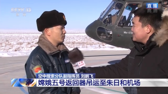 空中搜索分隊副指揮員 劉鵬飛: 第一步要到廠房把裏面的燃料放掉,然後再由運輸機轉運至我們的首都北京,到達北京之後,我們嫦娥五號的整個從發射到落地再到轉運,整個工作就順利地完成了,過程很不容易。