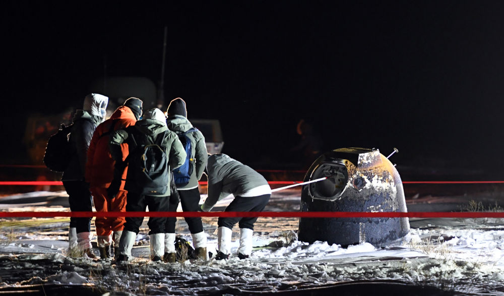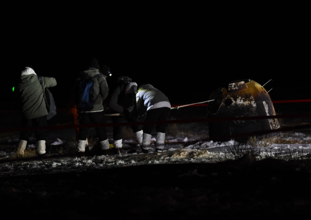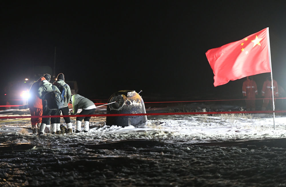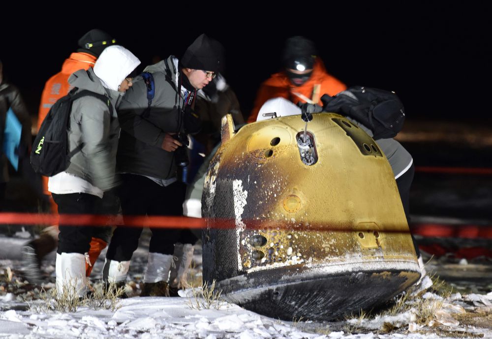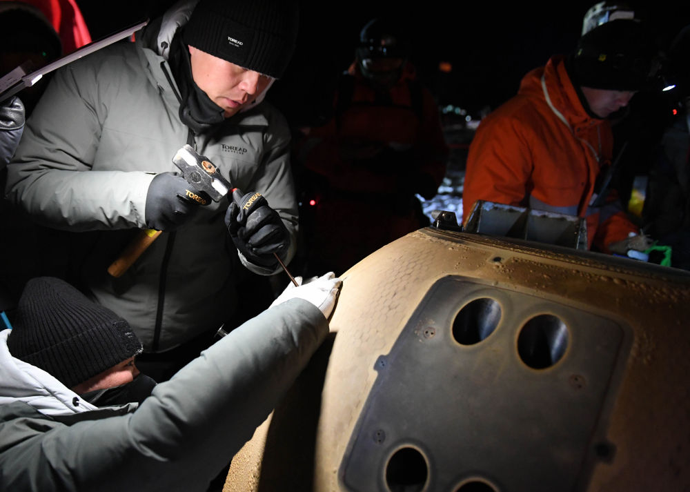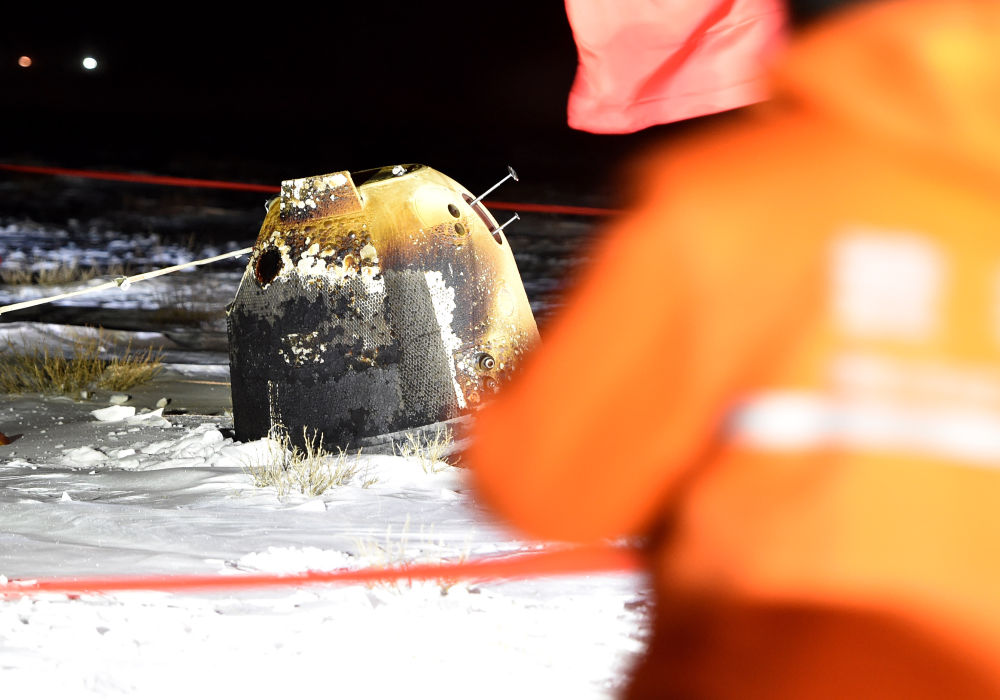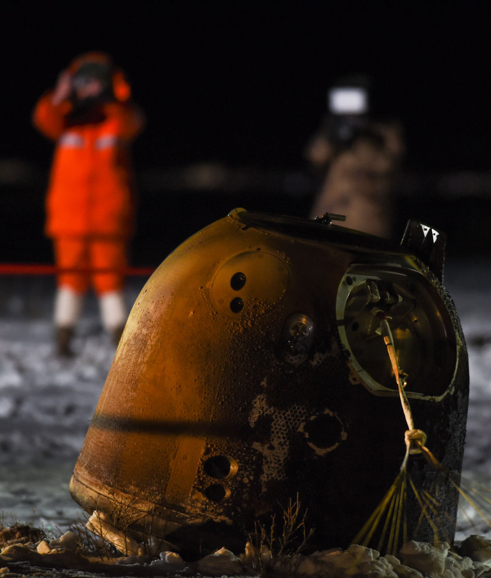 ↑12月17日,工作人員在嫦娥五號返回器着陸現場作業。