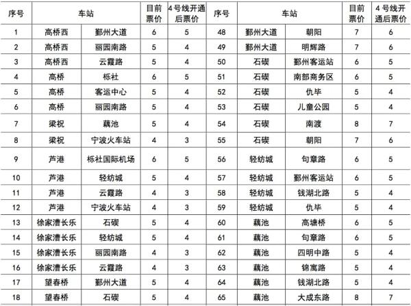 根據寧波市軌道交通線網票價方案,4號線繼續採用里程分段計價票制,實行“遞遠遞減”票價原則,與1號線、2號線、3號線換乘不影響票價計算。