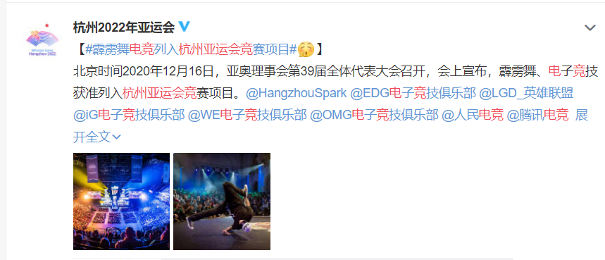 北京時間2020年12月16日,亞奧理事會第39次全體代表大會以線上線下相結合的形式召開。會上,電子競技和霹靂舞正式獲准列入杭州亞運會競賽項目。